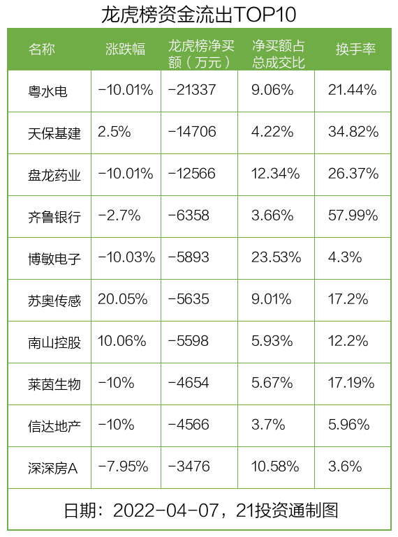 而龙虎榜中资金净流出最多的是粤水电(002060.SZ),被净卖出为2.13亿元,占总成交金额的9.06%。粤水电收盘下跌10.01%,换手率为21.44%。