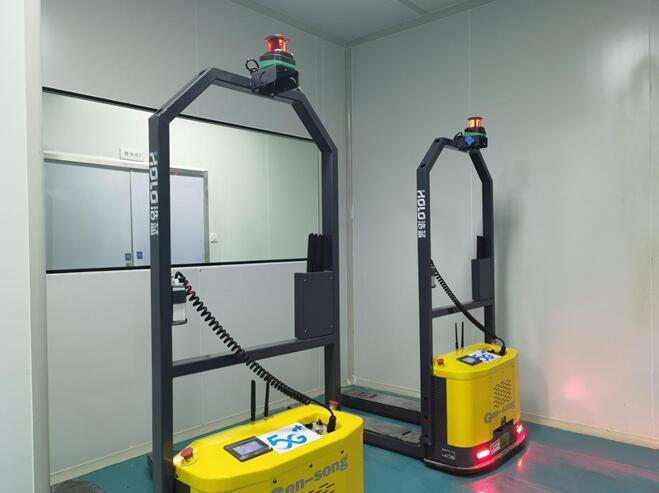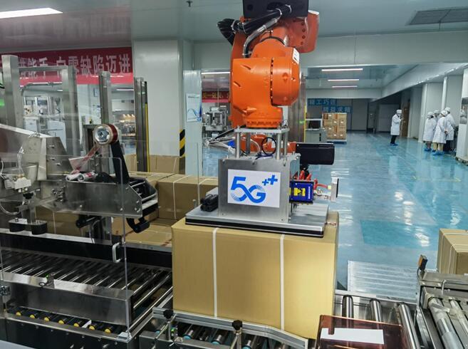 图为基于中国移动5G网络,AGV云化智能小车将产品打包成盒后自动转运