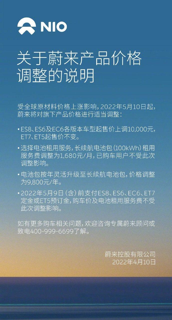 据悉,蔚来将从2022年5月10日起对旗下产品价格进行适当调整。其中,ES8、ES6及EC6各版本车型起售价上调1万元;BaaS电池租用价格,长续航电池包电池租用服务费由1480元/月调整为1680元/月;电池包按年灵活升级至长续航电池包的价格调整为9800元/年。