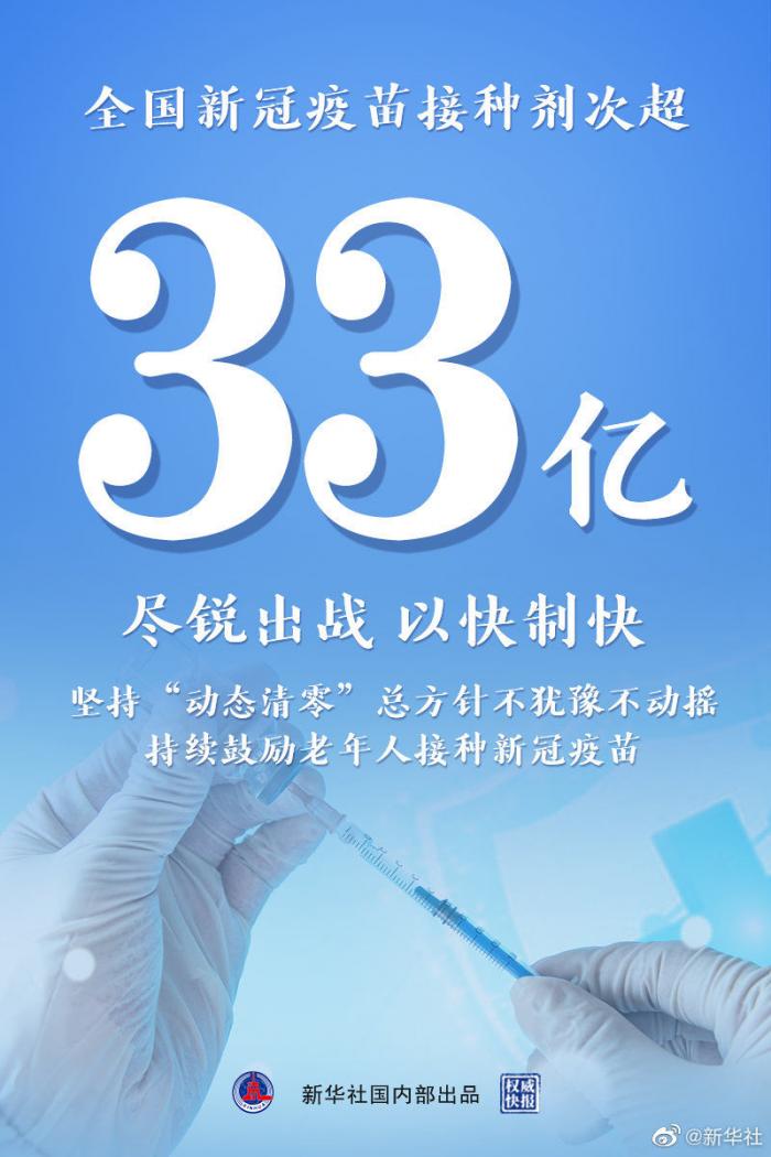 国家卫健委4月12日通报,全国新冠疫苗接种剂次超33亿。当前疫情仍在高位运行,要尽锐出战,以快制快,坚持“动态清零”总方针不犹豫不动摇。专家表示,接种新冠疫苗可有效降低老年人重症和死亡风险,呼吁符合接种条件的老年人及时按程序完成全程接种和加强免疫。