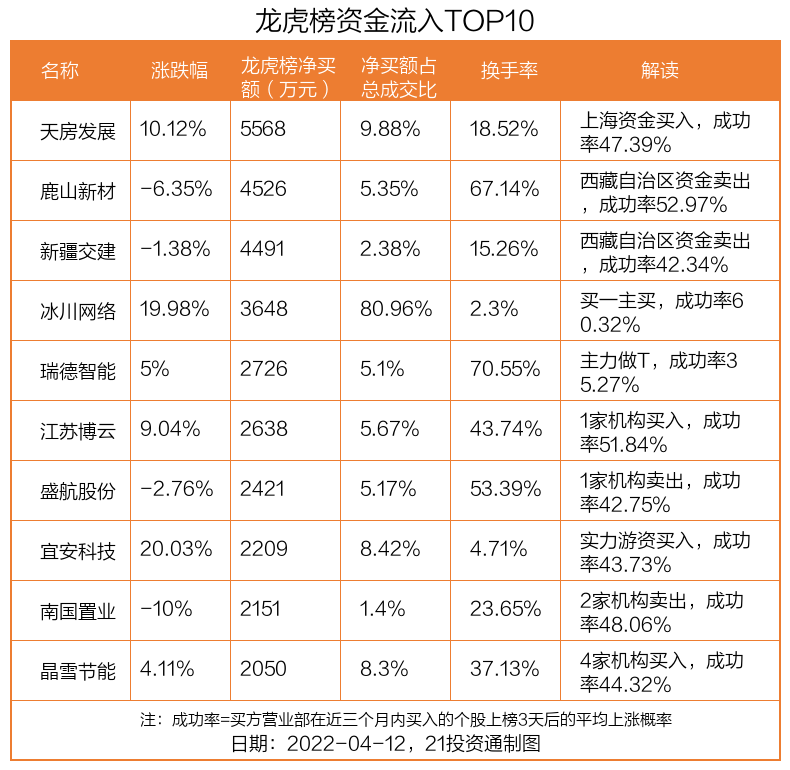 4月12日,上证指数上涨1.46%,深证成指上涨2.05%,创业板指上涨2.5%。盘后龙虎榜数据显示,共有50只个股因当日异动登上龙虎榜,资金净流入最多的是天房发展(600322.SH),达0.56亿元。