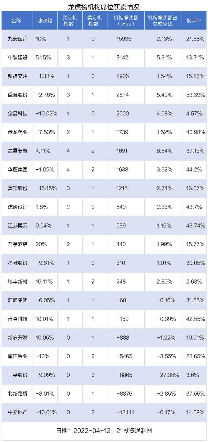 4月12日,21只个股龙虎榜出现了机构的身影,机构合计净卖出1549.43万元。具体来看,机构净买入14股,净卖出7股。
