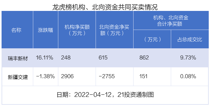 值得注意的是,机构和北向资金共同净买入了瑞丰新材;在新疆交建上出现分歧,机构净买入新疆交建2905.75万元,北向资金净卖出2754.69万元。