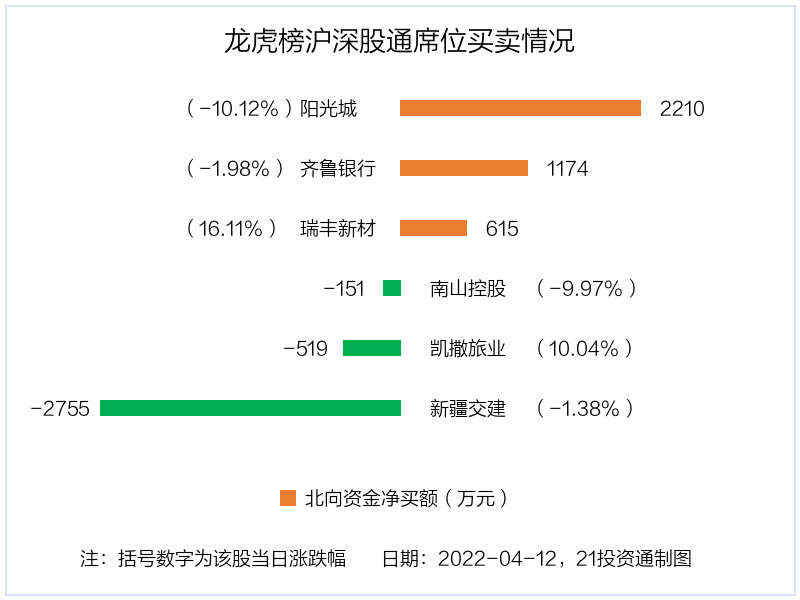 4月12日,北向资金参与龙虎榜中的个股共有6只,合计净买入574.34万元。其中沪股通净买入1 股,净买入1173.78万元;深股通净买入2 股,净卖出3 股,合计净卖出599.45万元。