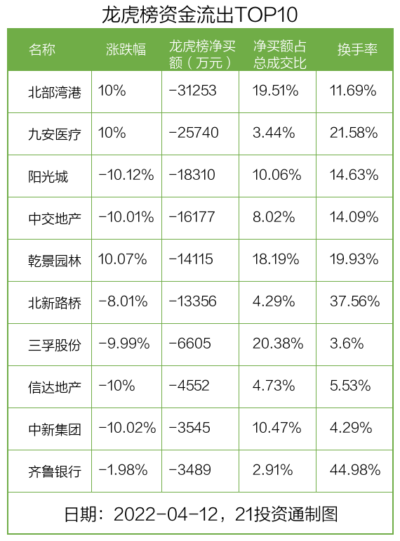 而龙虎榜中资金净流出最多的是北部湾港(000582.SZ),被净卖出为3.13亿元,占总成交金额的19.51%。北部湾港收盘上涨10%,换手率为11.69%。