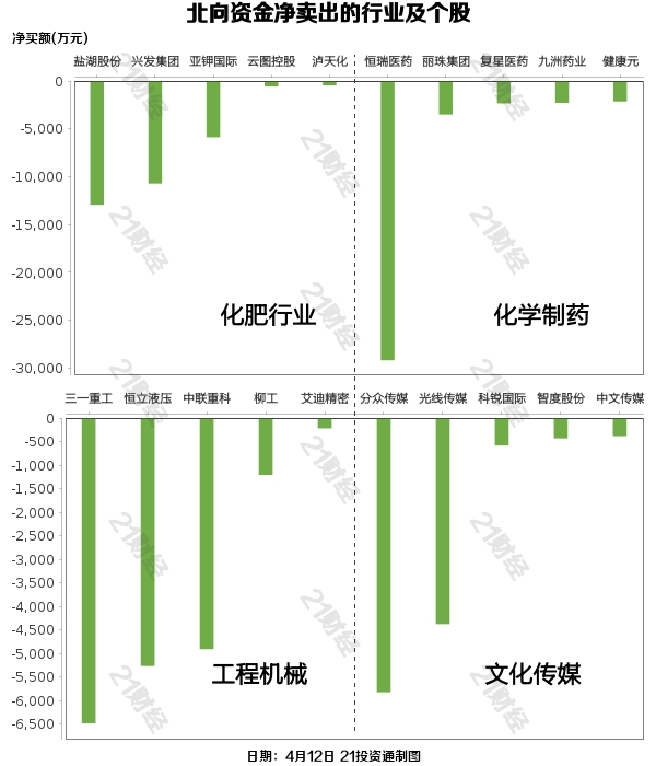 北向资金减持了15个行业,其中化肥行业最多,净卖出金额达2.89亿元,其次是化学制药行业,净卖出2.43亿元。