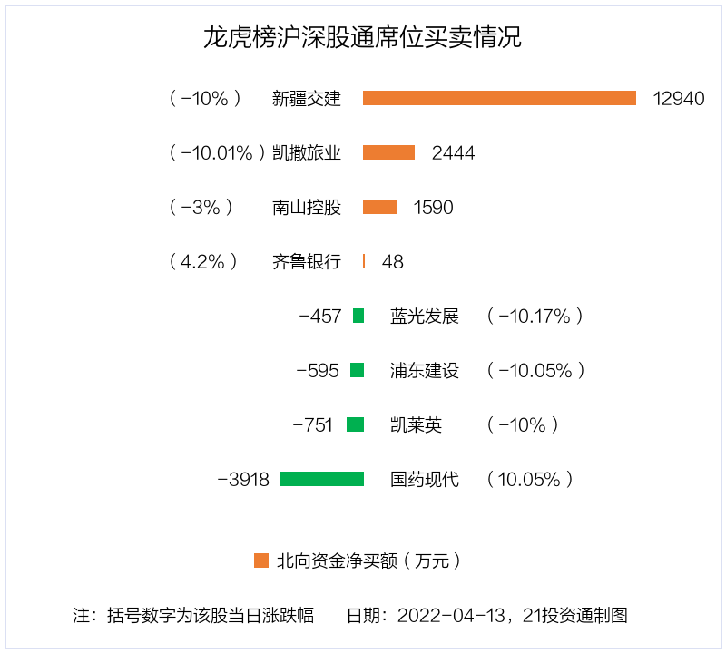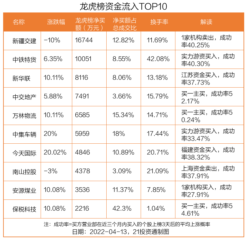 4月13日,上证指数下跌0.83%,深证成指下跌1.6%,创业板指下跌2.25%。盘后龙虎榜数据显示,共有50只个股因当日异动登上龙虎榜,资金净流入最多的是新疆交建(002941.SZ),达1.67亿元。