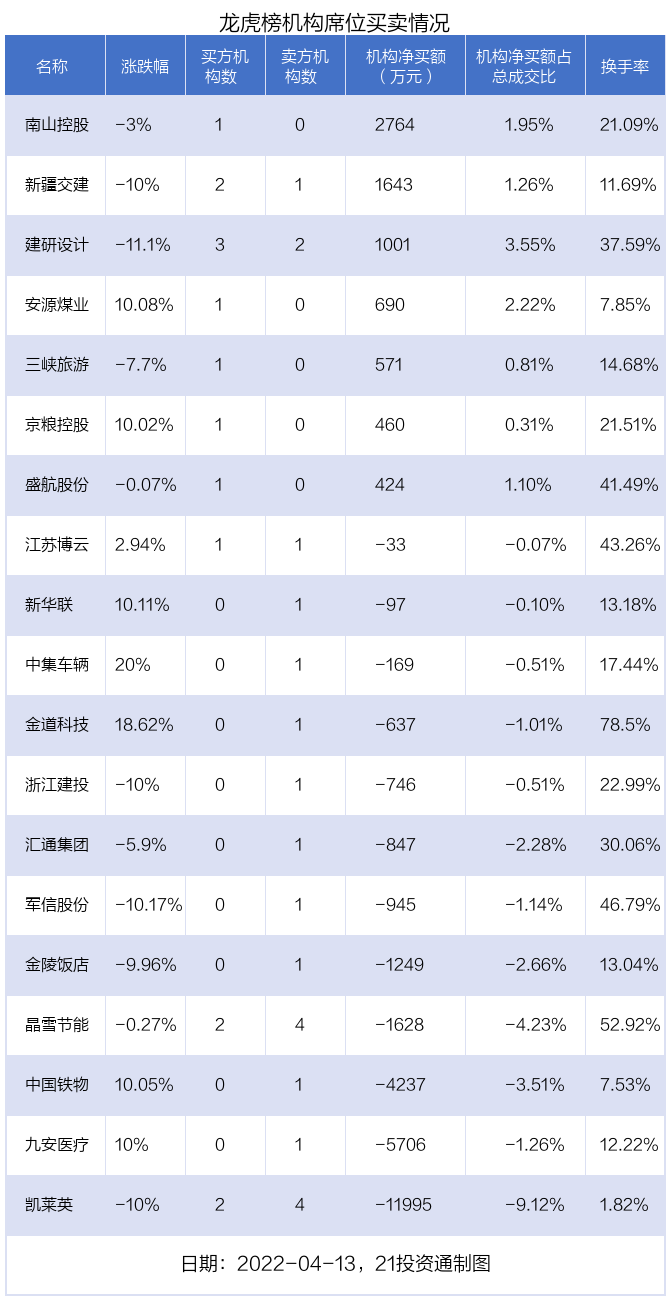 4月13日,19只个股龙虎榜出现了机构的身影,机构合计净卖出2.07亿元。具体来看,机构净买入7股,净卖出12股。