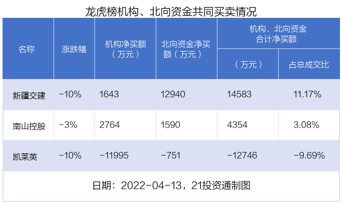 值得注意的是,机构和北向资金共同净买入了新疆交建、南山控股等2股;共同净卖出了凯莱英。