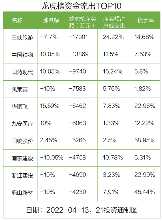 而龙虎榜中资金净流出最多的是三峡旅游(002627.SZ),被净卖出为1.7亿元,占总成交金额的24.22%。三峡旅游收盘下跌7.7%,换手率为14.68%。