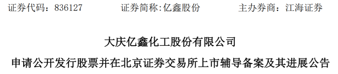 2021年12月22日,亿鑫股份与江海证券有限公司签订了《江海证券有限公司与大庆亿鑫化工股份有限公司关于向不特定合格投资者公开发行股票并在北京证券交易所上市之辅导协议》。