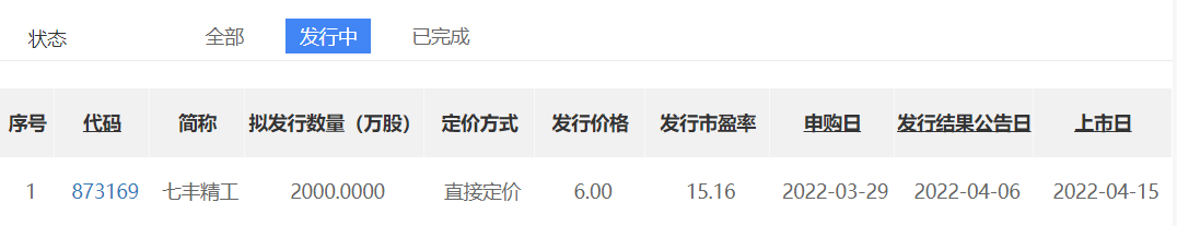 4月12日,北交所显示,第90家挂牌公司即将诞生。七丰精工(873169)将于4月15日(周五)上市。