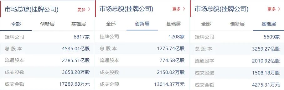 截至4月13日收盘,今日成交金额为1.73亿元,创新层成交金额为1.30亿元,基础层成交金额为0.43亿元;今日成交股数为3658.20万股,创新层成交股数为2150.02万股,基础层成交股数为1508.18万股。