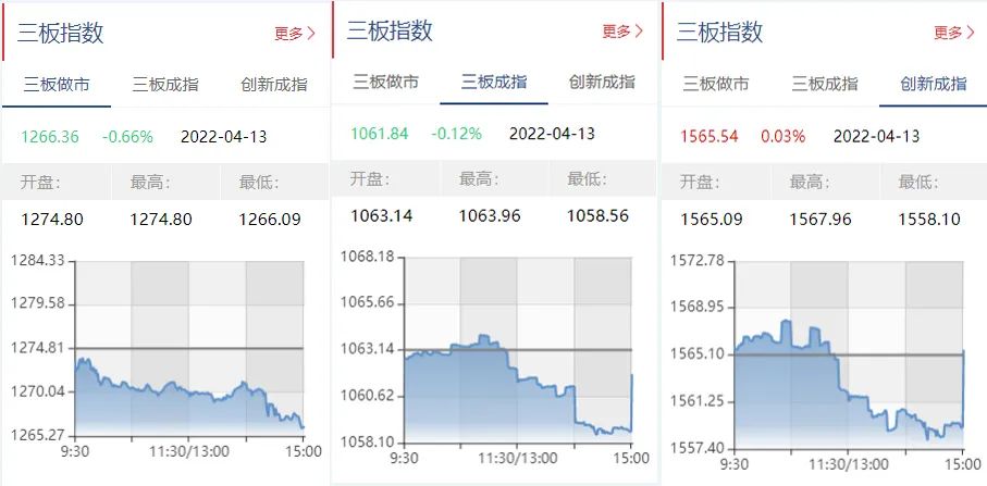 截至4月13日收盘,三板做市报1266.36点,下跌0.66%;三板成指报1061.84点,下跌0.12%;三板创新报1565.54点,上涨0.03%。