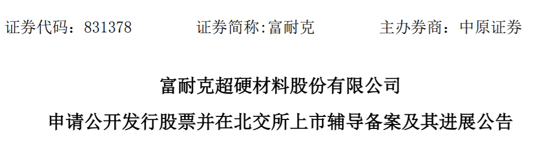 2021年12月10日,富耐克与中原证券股份有限公司签署了《富耐克超硬材料股份有限公司与中原证券股份有限公司之向不特定合格投资者公开发行股票并在北京证券交易所上市辅导协议》。