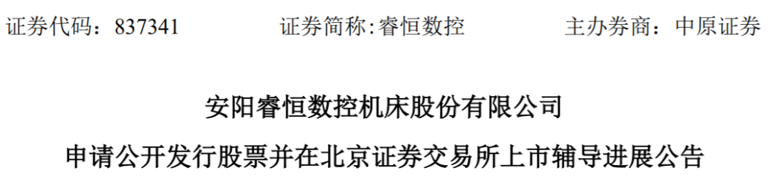 2021年4月12日,睿恒数控向中国证券监督管理委员会河南监管局报送了向不特定合格投资者公开发行股票并在精选层挂牌的辅导备案材料。
