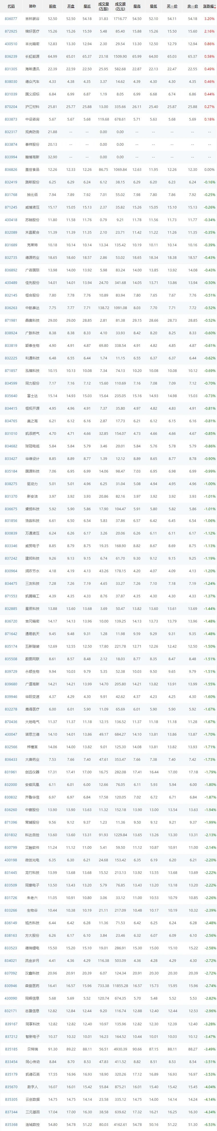其中,吉林碳谷(836077)涨幅居首,上涨3.20%;锦好医疗(872925)涨幅居次,上涨2.16%;连城数控(835368)跌幅居首,下跌6.53%;三元基金(837344)跌幅居次,下跌4.34%;盖世食品(836826)平盘。