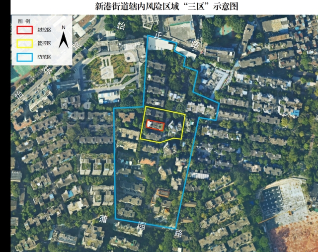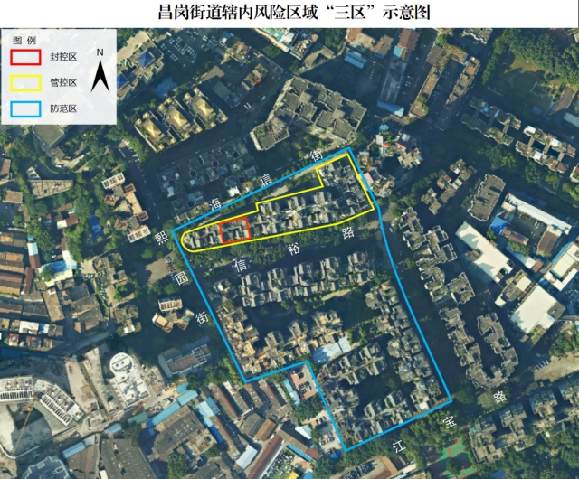 (三)防范区:昌岗街柏涛雅苑,新港街中大蒲园区666-669号、671号-674号、老年活动中心(664号-665号)、681号-690号、692号、695-698号。实行“强化社会面管控、严格限制人员聚集”管理措施。