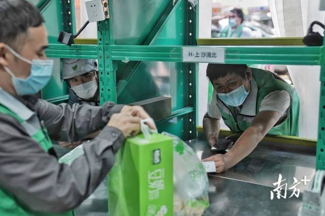 4月14日上午,广州白云区棠景街道三元里大道路面空空,路边的一道闸门里,不少身着绿色马甲的外卖小哥骑着电动车进进出出,“我的单准备好了吗?快快快,一箱牛奶、一份水果。”朴朴超市配送员王璐尧从配送窗口提下几袋物资放入尾箱,迅速上车出发。