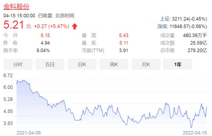 4月14日,金科股价结束多日颓势,强势反弹10%。4月15日,金科股份收盘报5.21元,涨5.47%。