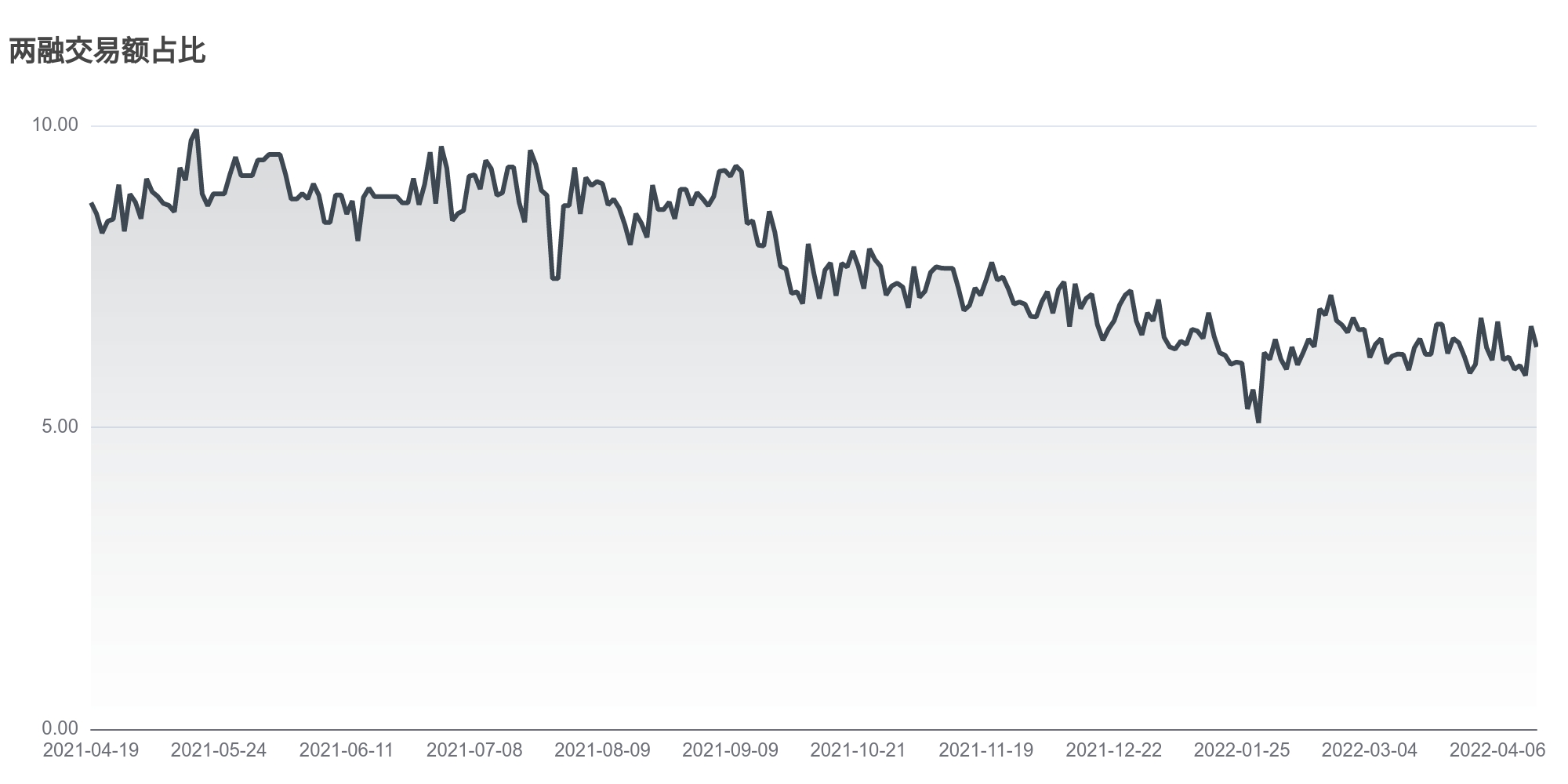 今日该指标值为6.33%,目前该指标处于近一年较低区间,说明投资者认为A股市场趋于触底反弹。反映场内投资者借钱炒股的杠杆水平,该指标越高说明杠杆水平越高,即投资者认为当前市场较强,反之则说明投资者认为市场相对较弱,因而与上证指数存在较强的正相关性。