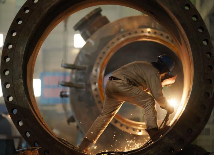 4月14日,在哈电集团哈尔滨锅炉厂有限责任公司车间,工人进行生产作业。新华社记者 王建威 摄