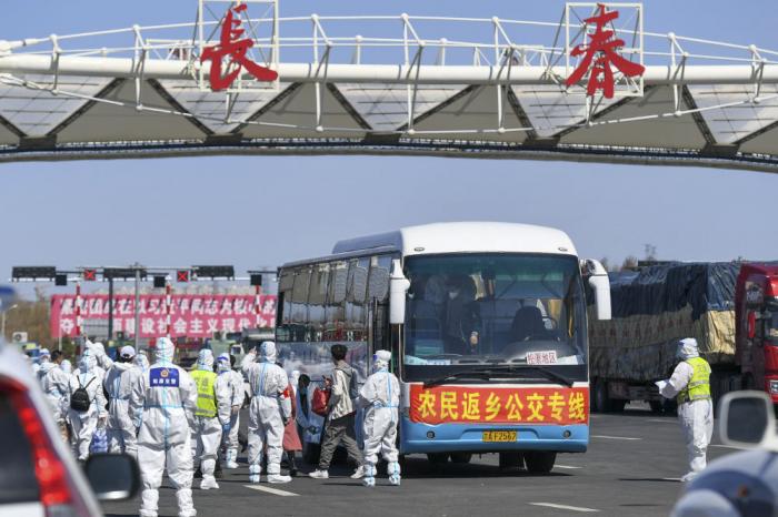 在吉林长春高速公路东出口,返乡农民登上返乡公交专线(4月12日摄)。新华社发