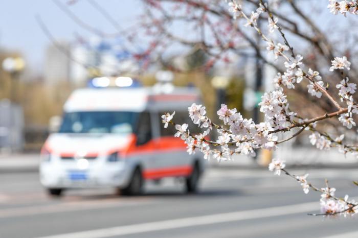 4月14日,一辆救护车在吉林市松江东路上驶过,路边桃花已经盛开。新华社记者 张楠 摄