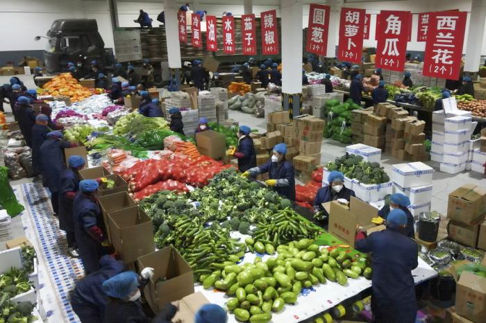 吉林省梅河口市工作人员进行“蔬菜包”菜品分拣(4月7日摄,无人机照片)。新华社发