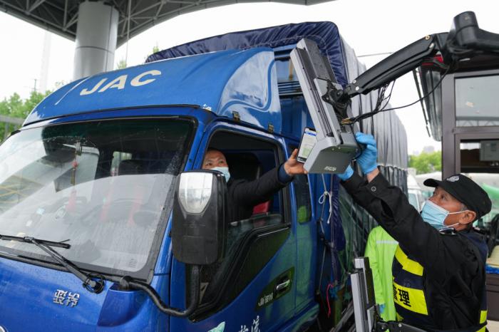 4月13日,在合肥百大周谷堆大兴农产品物流园,司机在智能化门禁系统上扫码进入。该园建立集测温、核验安康码、数据收集等功能的智能化门禁系统,进场驾乘人员不用下车即可快速核验,实现防疫测温智能化、人车追溯数据化。新华社记者 杜宇 摄