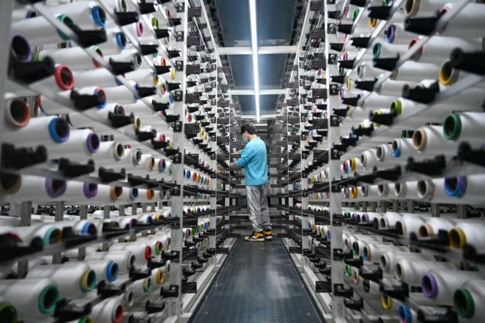 4月12日,在福建泉州石狮市的一家纺织企业,工人在工厂里忙碌。新华社发(周义摄)