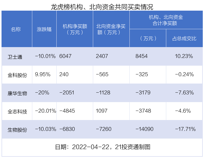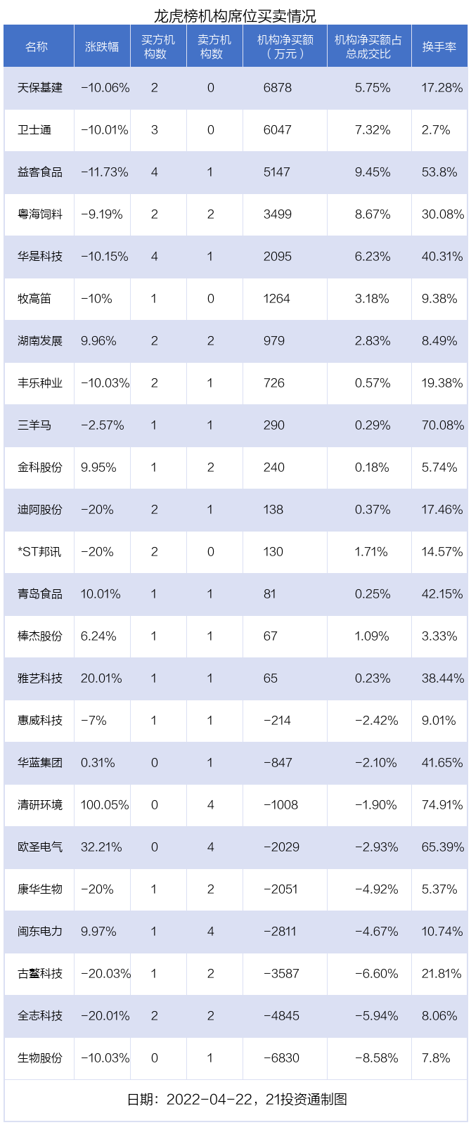 4月22日,24只个股龙虎榜出现了机构的身影,机构合计净买入3425.65万元。具体来看,机构净买入15股,净卖出9股。
