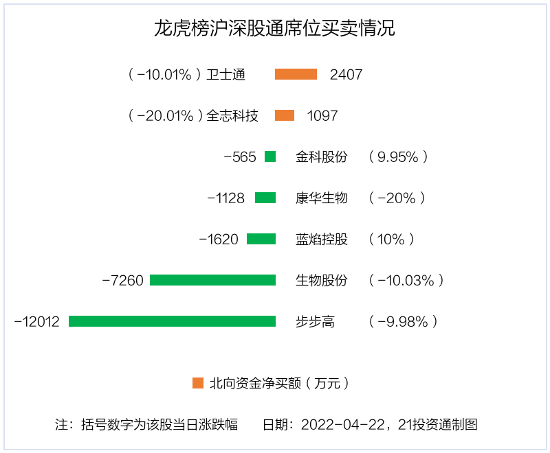 4月22日,北向资金参与龙虎榜中的个股共有7只,合计净卖出1.91亿元。其中沪股通净卖出1 股,合计净卖出7260.49万元;深股通净买入2 股,净卖出4 股,合计净卖出1.18亿元。