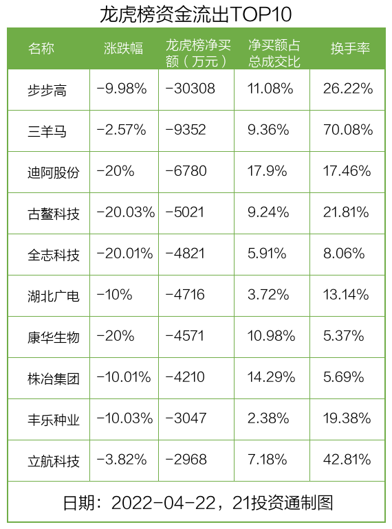 而龙虎榜中资金净流出最多的是步步高(002251.SZ),被净卖出为3.03亿元,占总成交金额的11.08%。步步高收盘下跌9.98%,换手率为26.22%。
