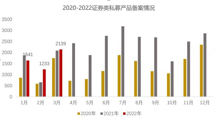 根据基金业协会数据,3月新备案私募管理人共计120家,其中新备案证券类私募管理人共计48家,管理人备案数量较上月有所增加。产品方面,3月协会新备案证券类私募产品2139只,较2月的1233只产品来说几乎翻倍,而对比2020年、2021年同期来说,3月新备案的证券类私募产品也出现了增长。