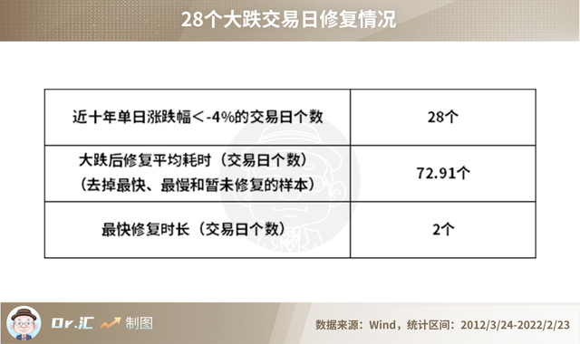 再进一步挖掘这28个大跌的交易日,不难发现,除了2015年“牛市”顶点附近的4组样本,其他24个样本均已修复到大跌前一天的收盘价。去掉最快、最慢以及暂未修复的样本,平均修复时长为72.91个交易日,其中有15次在30个交易日内就修复到了大跌前一天的收盘价,占总样本比达53.57%,而最快的一次耗时仅为2个交易日。