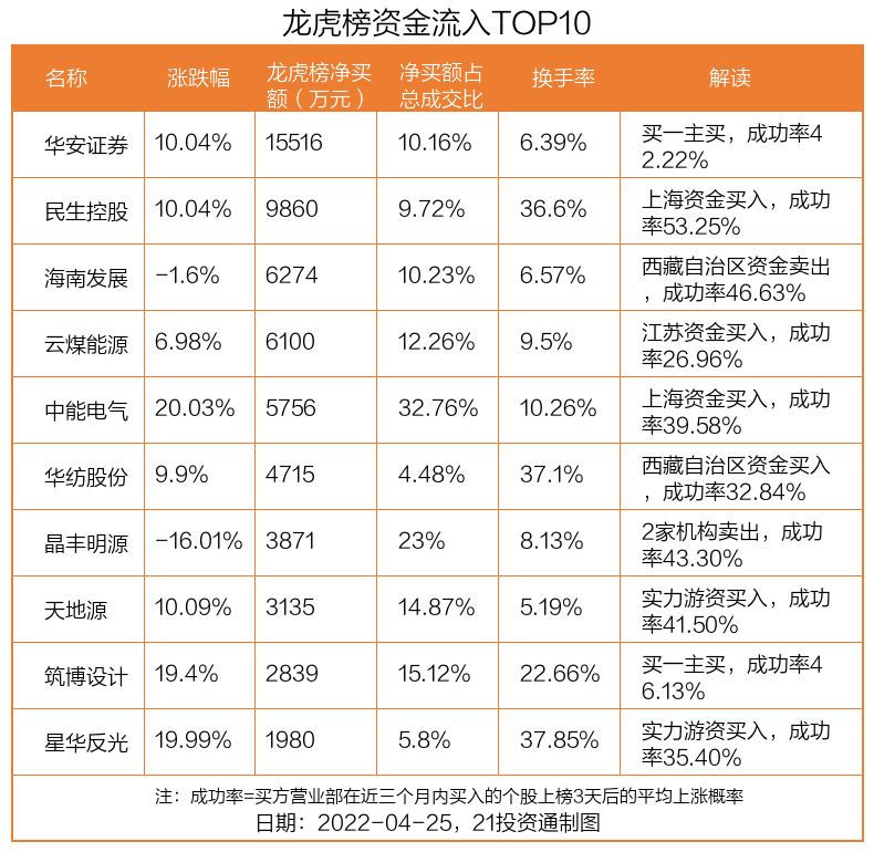 4月25日,上证指数下跌5.13%,跌破3000点整数关口,收于2928.51点,创近两年新低;深证成指下跌6.08%;创业板指下跌5.56%。盘后龙虎榜数据显示,共有46只个股因当日异动登上龙虎榜,资金净流入最多的是华安证券(600909.SH),达1.55亿元。