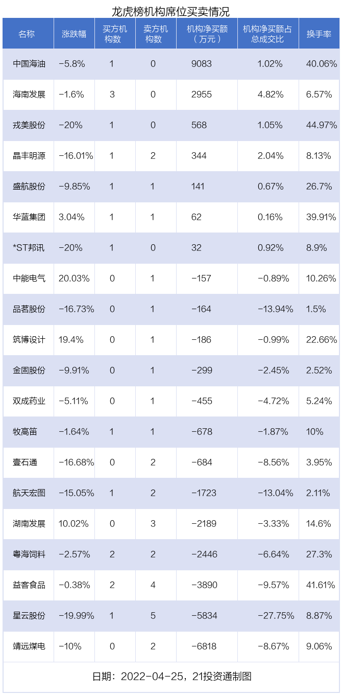 其中,机构净买入金额最多的是中国海油(600938.SH),当日收盘下跌5.8%,换手率为40.06%。