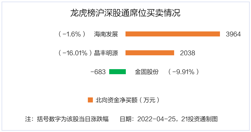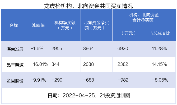 值得注意的是,机构和北向资金共同净买入了海南发展、晶丰明源等2股;共同净卖出了金固股份。