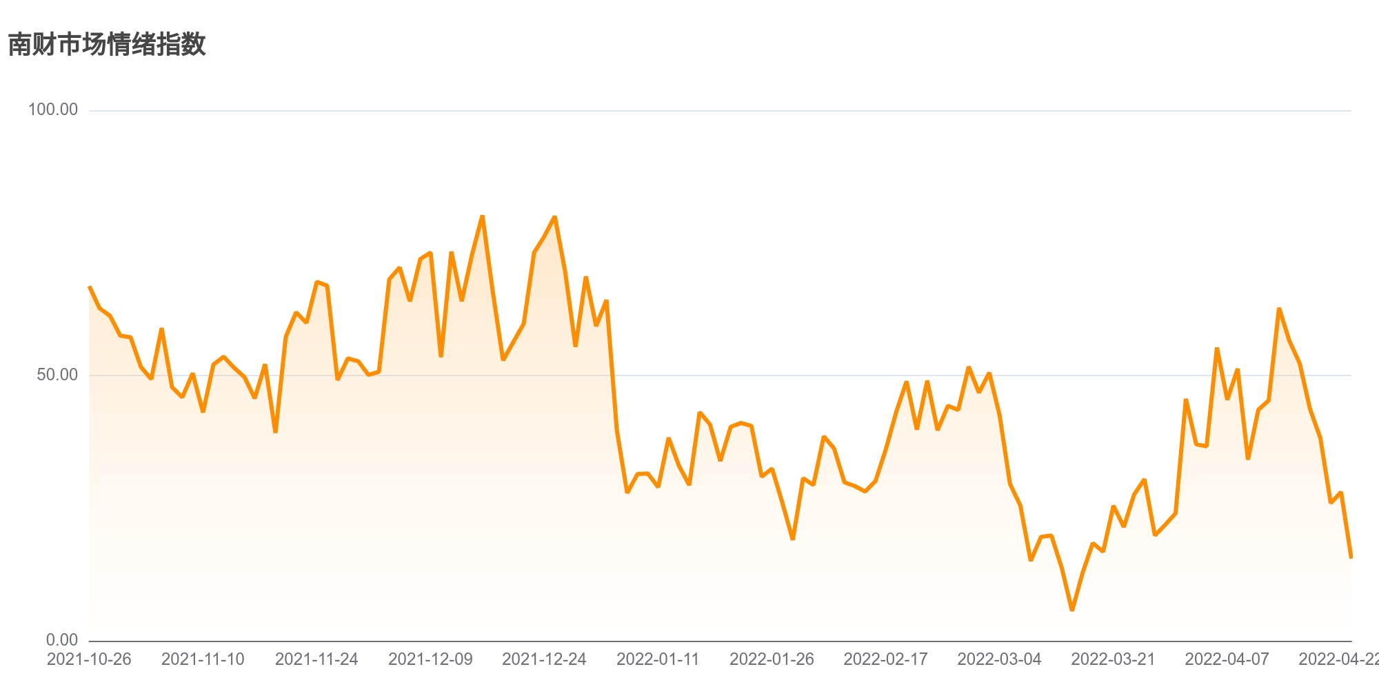 今日南财市场情绪指数为15.5,较前日28.0大幅下跌,市场投资热度明显降低。A股市场的行为是非常情绪化的,当市场上涨时,投资者趋于贪婪,产生追涨情绪;当市场下跌时,往往会失去理智急于出售他们的资产。为量化投资者当前对购买股票的情绪程度,基于中国波指(iVIX)与CNN恐慌贪婪指数,南财量化团队挑选出五大指标,综合加权得到了南财情绪指数。南财情绪指数范围从0-100,越低表明市场投资热度较低,越高表明市场投资热度较高。南财情绪指数有助于市场参与者更好地认识和分析股票市场的波动风险和跳跃风险,市场投资热度偏低表明投资者过于担心,如果当前市场定价并不高,这可能是一个买入机会。市场投资热度偏高则表明投资者过于兴奋,如果市场处于高位,市场可能会进行调整。南财情绪指数的发布,不仅有利于投资者进行更佳的风险管理,也为维持金融市场的稳定繁荣提供了有效的参考依据。
