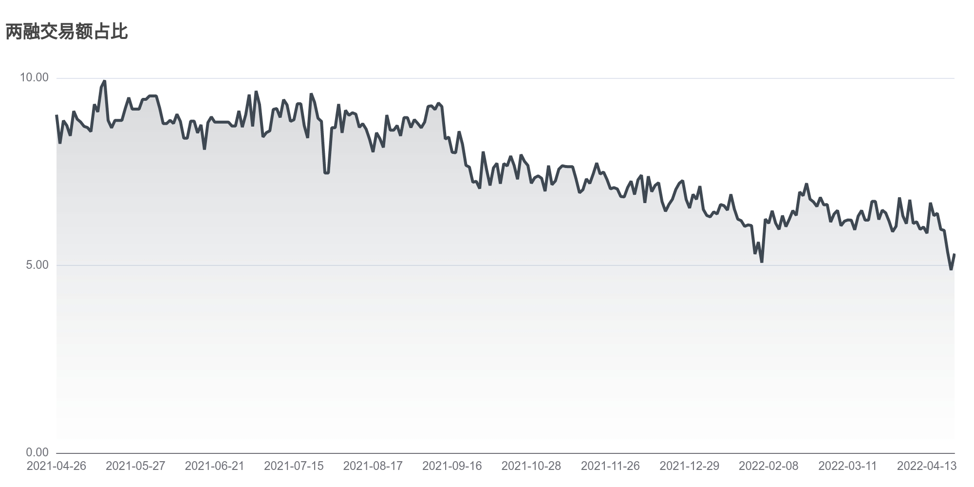 今日该指标值为5.32%,目前该指标处于近一年较低区间,说明投资者认为A股市场趋于触底反弹。反映场内投资者借钱炒股的杠杆水平,该指标越高说明杠杆水平越高,即投资者认为当前市场较强,反之则说明投资者认为市场相对较弱,因而与上证指数存在较强的正相关性。