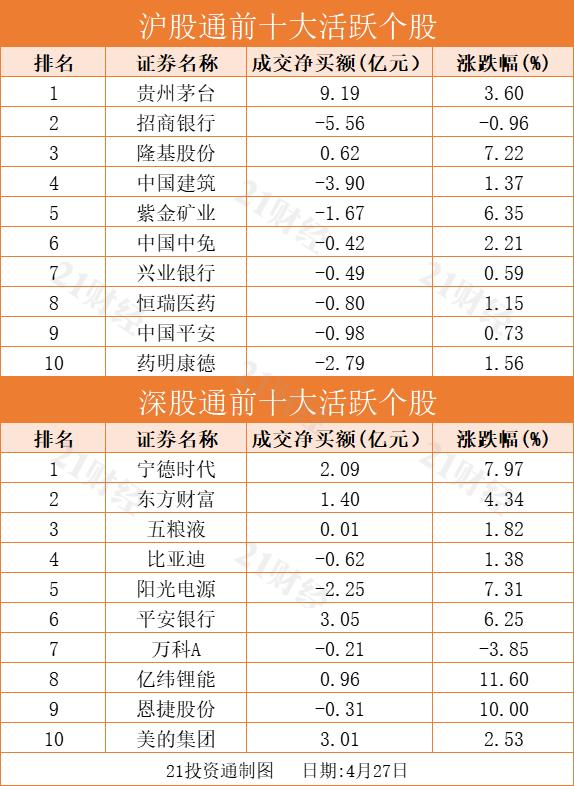 十大活跃个股方面,贵州茅台、平安银行、美的集团分别获净买入9.19亿元、3.05亿元、3.01亿元。