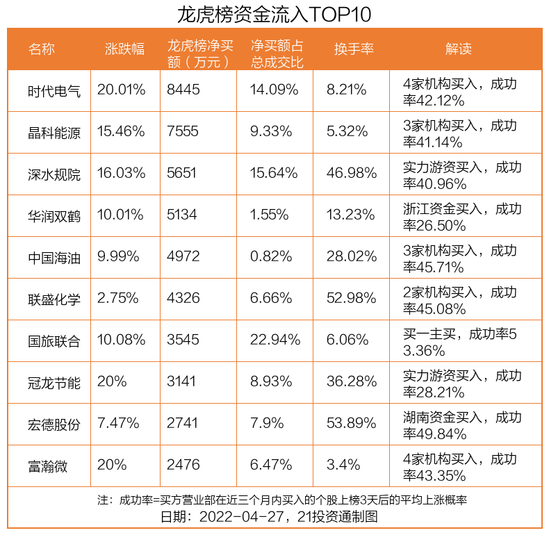 盘后龙虎榜数据显示,共有58只个股因当日异动登上龙虎榜,资金净流入最多的是时代电气(688187.SH),达0.84亿元。