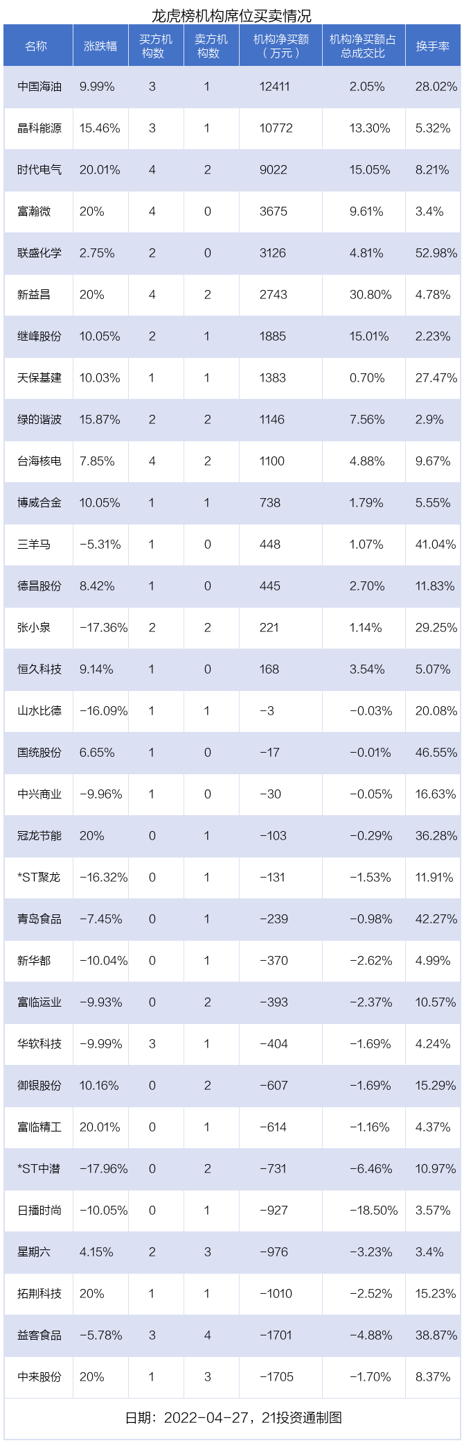 其中,机构净买入金额最多的是中国海油(600938.SH),当日收盘上涨9.99%,换手率为28.02%。
