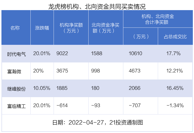 值得注意的是,机构和北向资金共同净买入了时代电气、富瀚微、继峰股份等3股;共同净卖出了富临精工。