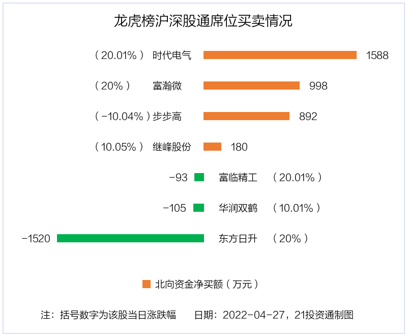 4月27日,北向资金参与龙虎榜中的个股共有7只,合计净买入1939.77万元。其中沪股通净买入2 股,净卖出1 股,合计净买入1662.85万元;深股通净买入2 股,净卖出2 股,合计净买入276.92万元。