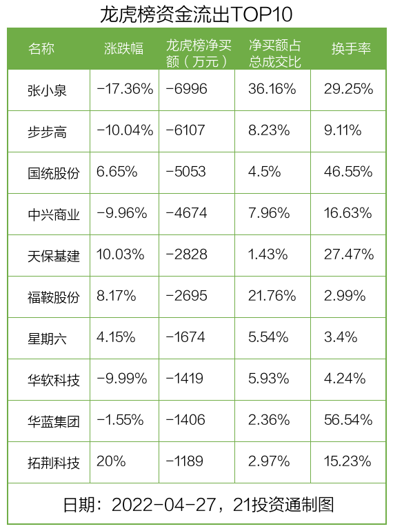 而龙虎榜中资金净流出最多的是张小泉(301055.SZ),被净卖出为0.7亿元,占总成交金额的36.16%。张小泉收盘下跌17.36%,换手率为29.25%。