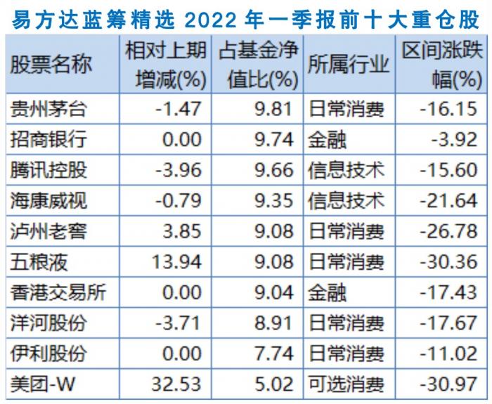易方达蓝筹精选十大重仓股主要集中在食品饮料个股贵州茅台、泸州老窖、五粮液、洋河股份、伊利股份,金融个股招商银行、港交所,以及科技互联网个股腾讯控股、美团、海康威视。