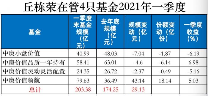 由于在大震荡的一季度业绩出色,丘栋荣管理的中庚价值领航基金一季度获得18.14亿份净申购。