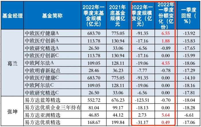2022年一季度,随着股市大震荡,明星基金经理规模普遍大缩水。